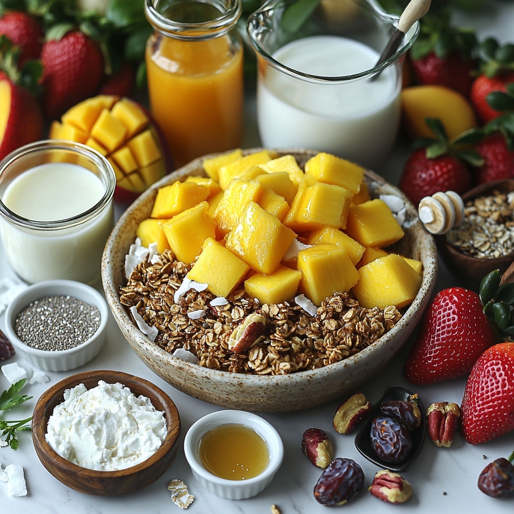 Gathering the right ingredients is simpler than you might think, and each one plays a vital role in building the perfect balance of flavor, creaminess, and nutrition in the Best Mango Strawberry Smoothie Bowl – Quick & Nutritious Breakfast Recipe.