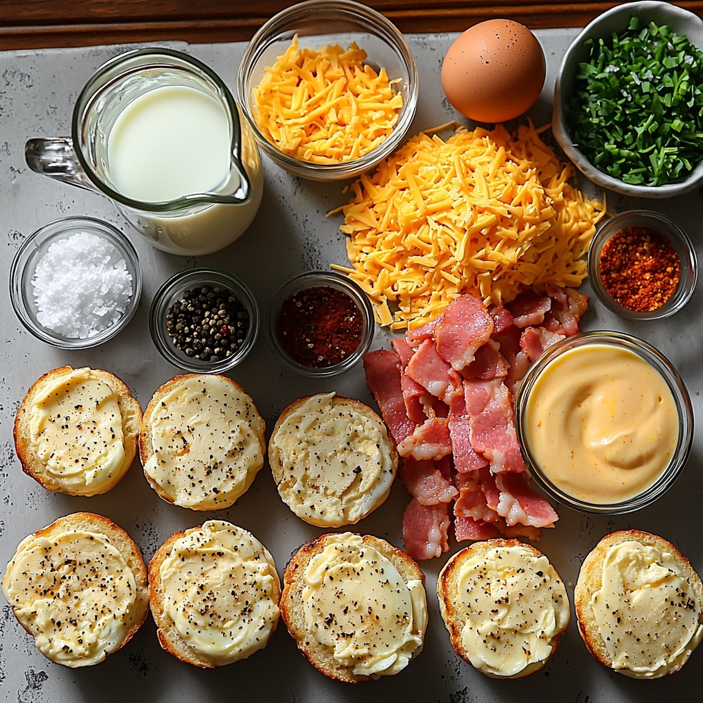 Spread the quartered English muffins evenly in the baking dish, then layer the Canadian bacon or ham on top. Pour the egg mixture evenly over the layers, letting it soak into the muffins and meat. Finally, sprinkle the shredded cheddar cheese across the surface to melt into a deliciously cheesy crust.