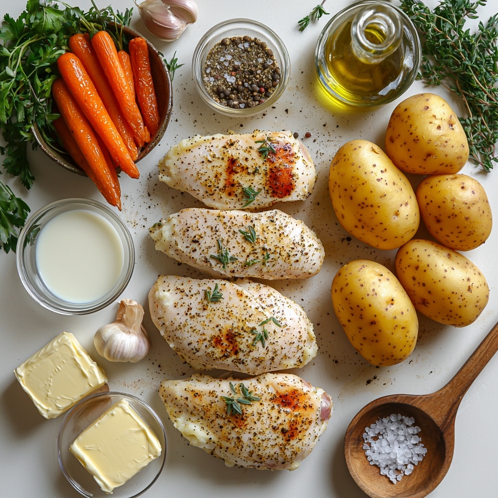 These ingredients are simple staples, yet each one plays a crucial role in creating the perfect balance of flavors, textures, and colors in the Garlic Herb Chicken with Creamy Mashed Potatoes and Roasted Carrots Recipe. From the earthy herbs to the silky potatoes and vibrant carrots, this list will guide you to a delicious home-cooked meal.