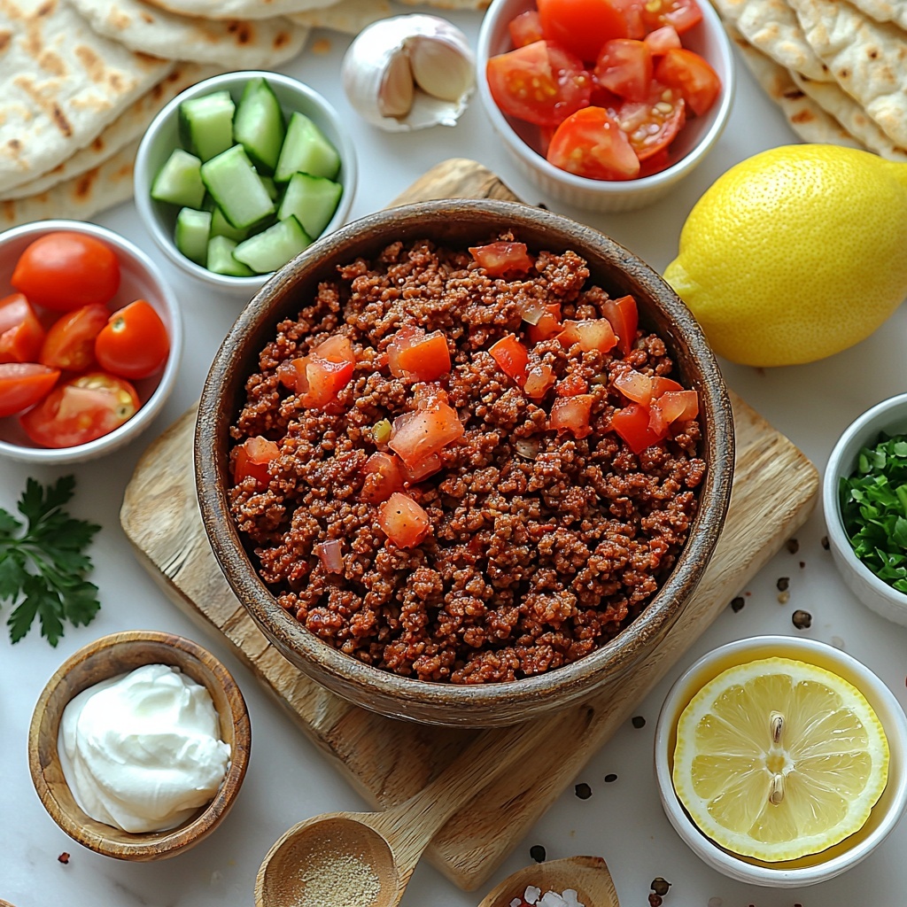 A flavorful Greek-inspired recipe featuring seasoned ground beef stuffed into warm pita breads, topped with fresh tomatoes, cucumbers, parsley, and a tangy lemon garlic Greek yogurt sauce. This quick and easy meal is perfect for a satisfying lunch or dinner packed with Mediterranean flavors.