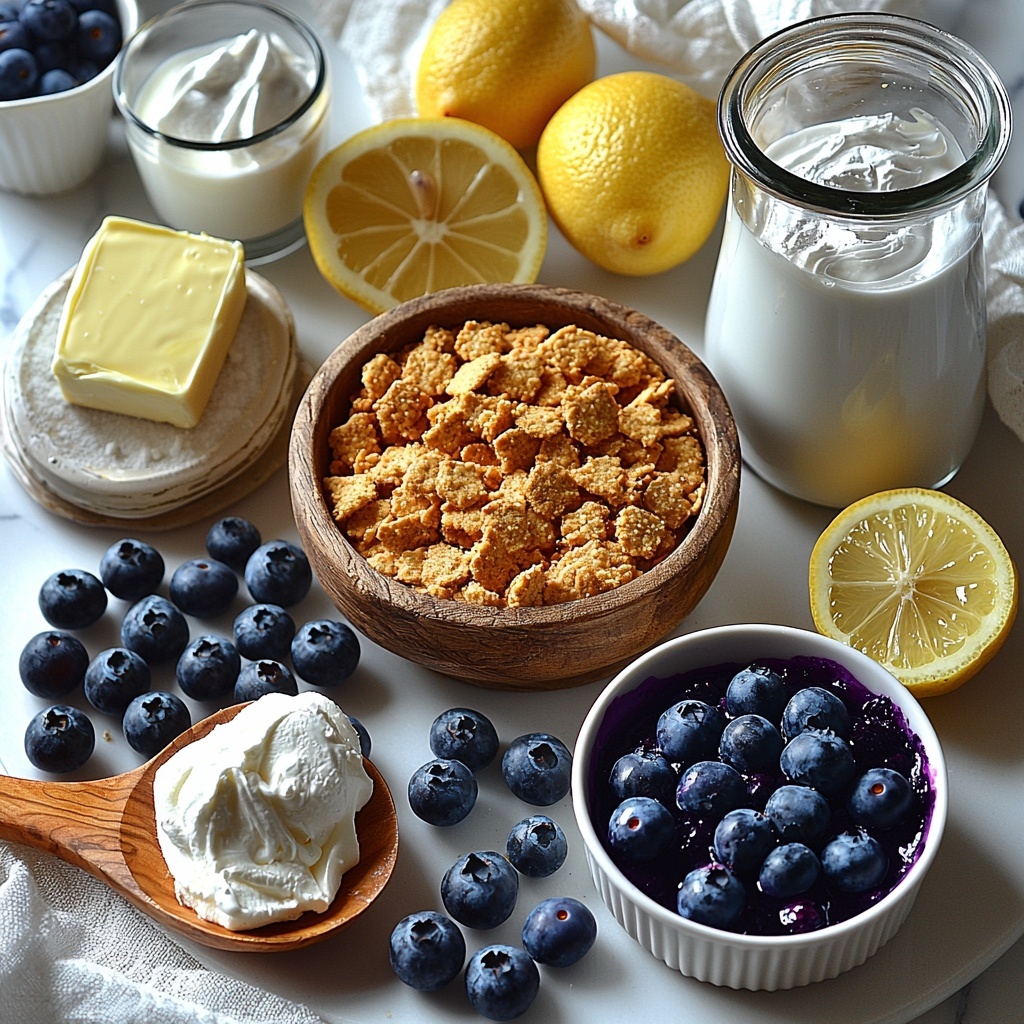 This recipe uses a handful of simple yet essential ingredients that each play a vital role in crafting the perfect balance of flavor, texture, and color. From the buttery crust to the zesty lemon cheesecake and sweet blueberry topping, every component enhances the overall deliciousness effortlessly.