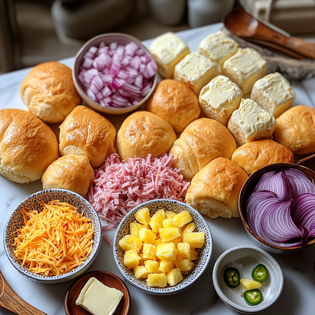Gathering the right ingredients is half the fun of making this dish! Each component is chosen to create a balanced bite—soft and sweet rolls, creamy cheeses with sharp character, juicy ham, and that irresistible pineapple zing come together in harmony.