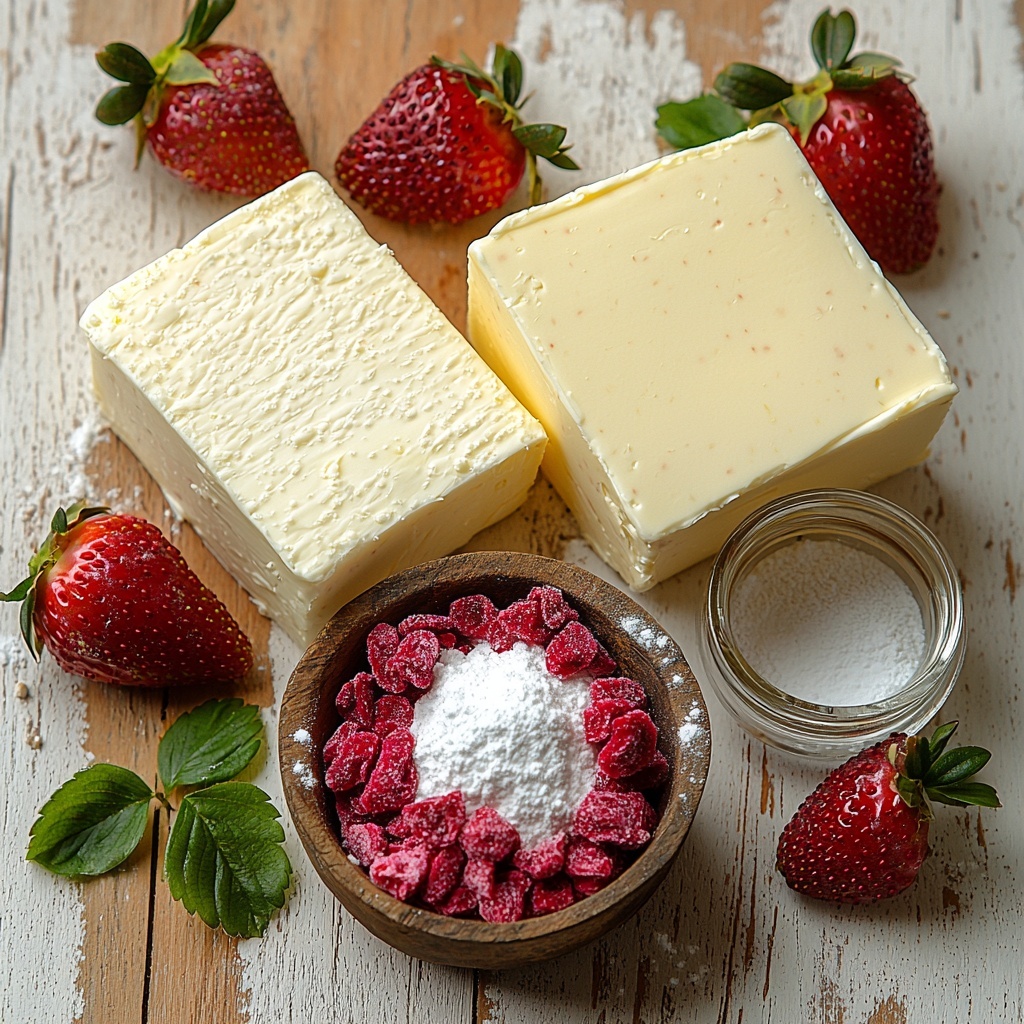 Crafting this Strawberry Cream Cheese Frosting Recipe requires simple yet carefully selected ingredients that each play a crucial role in delivering that perfect texture and flavor. From the rich cream cheese to the naturally sweet pop of freeze-dried strawberries, every element is essential to creating frosting magic.