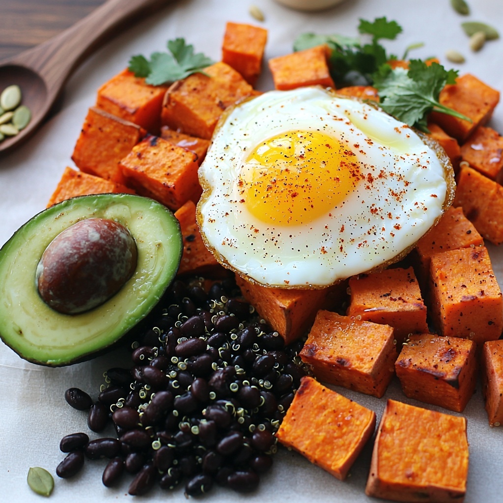 - Assemble the Bowl: In a serving bowl, layer the warm quinoa, roasted sweet potatoes, and black beans. Top with sliced avocado and the cooked egg.