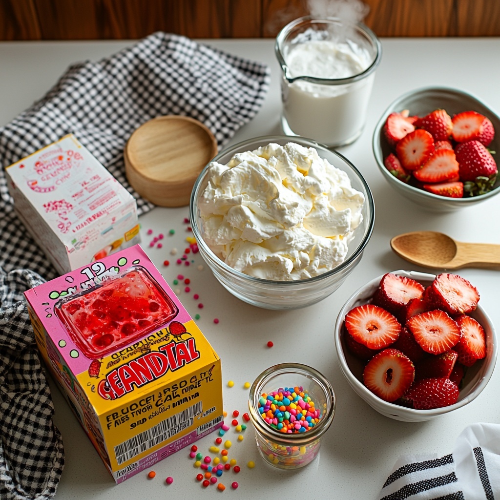 - Whipped topping (8 oz) or fresh whipped cream (~3 cups): Adds a creamy, light finish that complements the fruity gelatin.